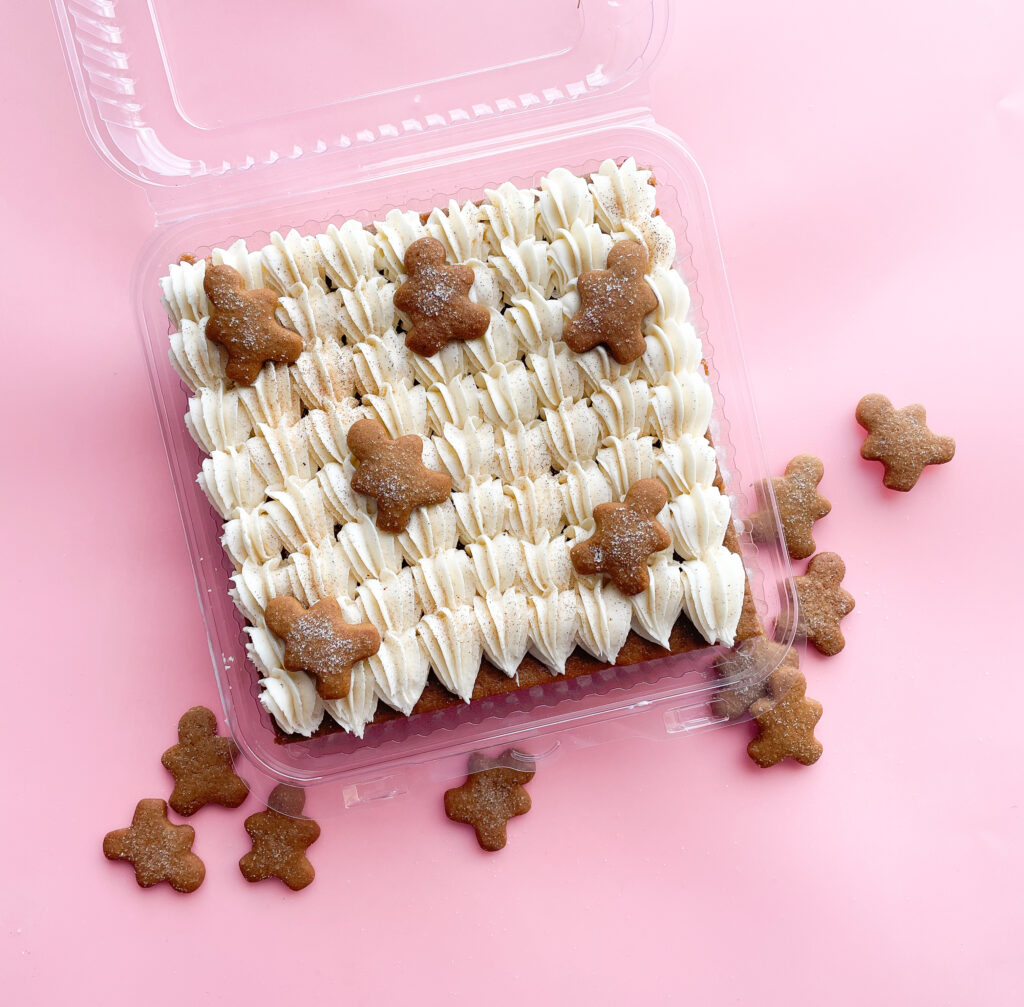 Our moist a rich apple cake iced with a cinnamon caramel buttercream, topped with a brown sugar oat crumble.